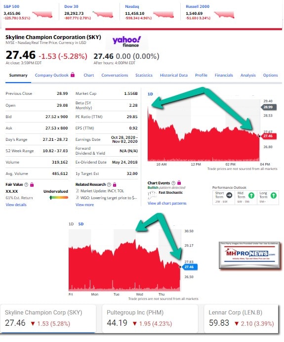 MHProNews’ report on Skyline Champion retailers and rivals reacting to their corporate policies is the backdrop to the featured focus report shown below. As usual, that follows the quotable quotes, the left-right media headlines, and 2 of our 3 market snapshots at the closing bell today.