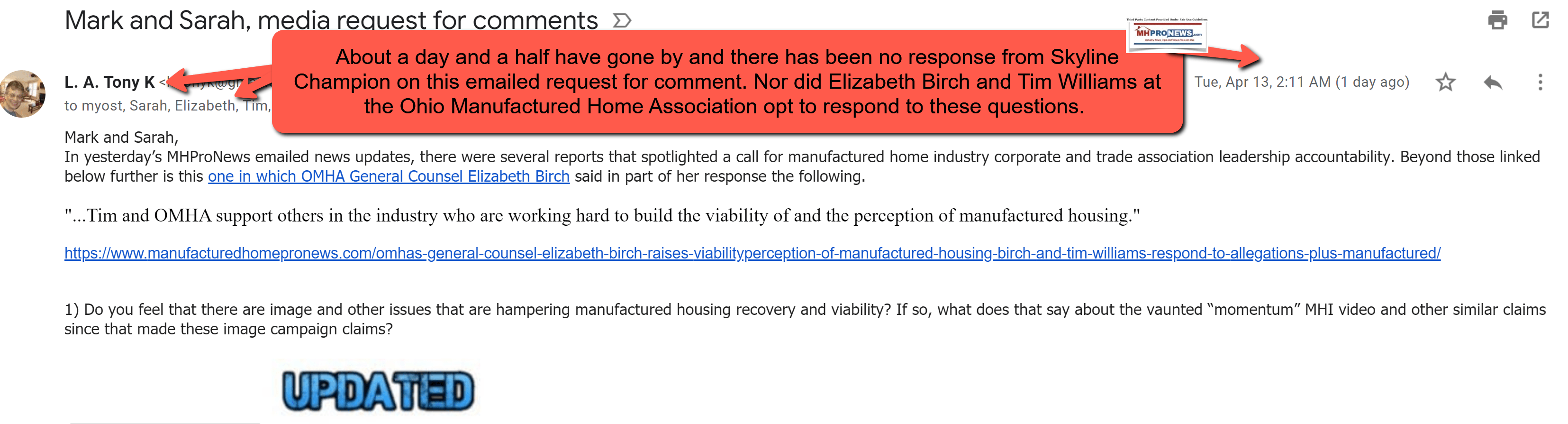 With that backdrop, MHProNews reached out to Skyline Champion CEO Mark Yost and SKY’s media relations contact Sarah Janowicz. That was about 1½ days ago and they have not responded to the following requests for comment (sent Apr 13, 2021, 2:11 AM ET).