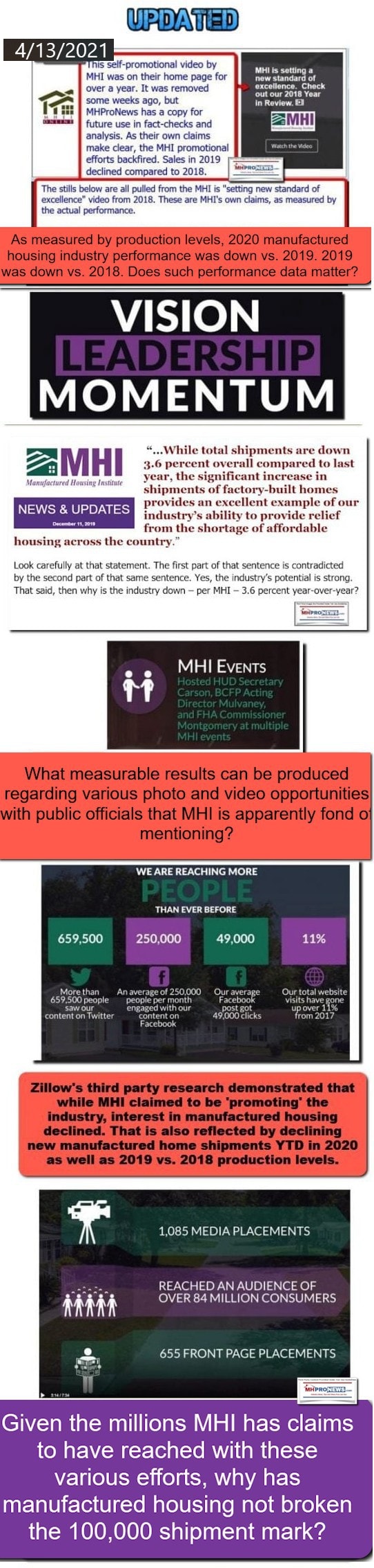 1) Do you feel that there are image and other issues that are hampering manufactured housing recovery and viability? If so, what does that say about the vaunted “momentum” MHI video and other similar claims since that made these image campaign claims?