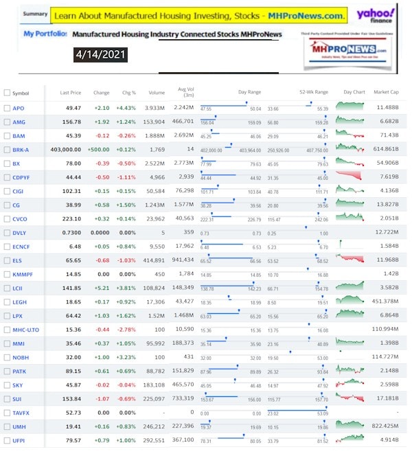 Manufactured Housing Industry Investments Connected Closing Equities Tickers