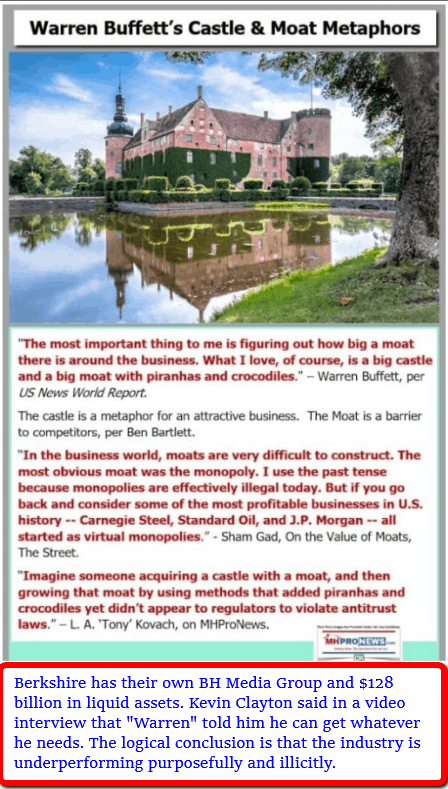 MHI has demonstrated ACCESS. What they haven’t demonstrated is CLOUT on behalf of the majority of independents in the manufactured housing industry. Indeed, they arguably have demonstrated that they are foot dragging and/or fumbling. Why? So that the Buffett ‘castle and moat’ process can slowly and steadily result in consolidation of smaller firms by larger ones.