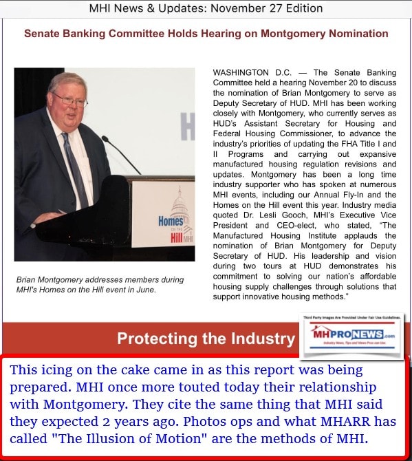 MHProNews is on record for asking for the removal of Brian Montgomery at HUD, whose purported conflicts of interest and key position make him arguably a detriment to full and proper HUD Code manufactured housing implementation.