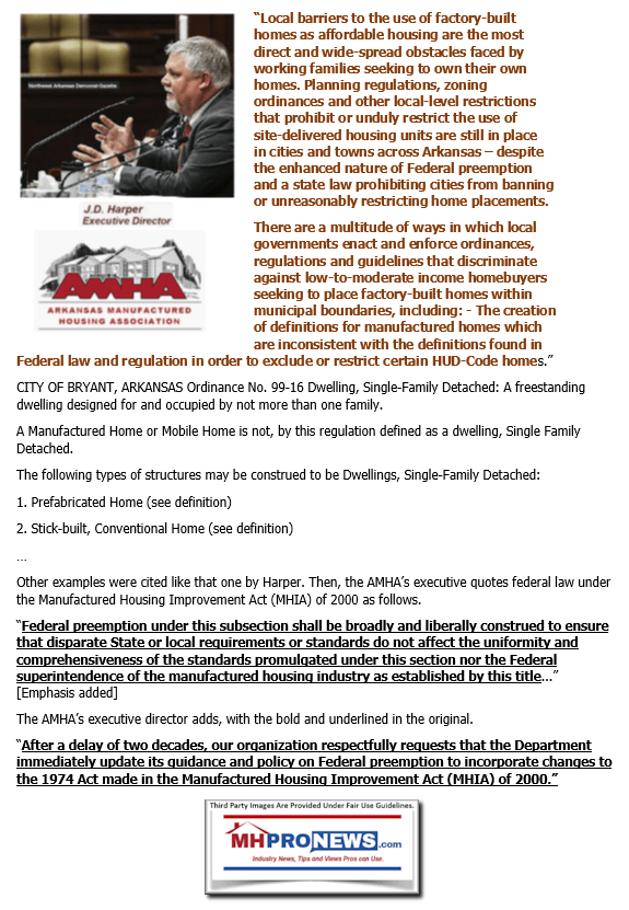 That letter to Dr. Carson is attached here. Note too by contrast to MHI, MHARR – whose website is about 3 years old vs. MHI’s which is some 20 plus years online – has numerous references to federal enhanced preemption. Why does MHI hide the ball on enhanced preemption from the general public if they are sincere in wanting it implemented at this time?
