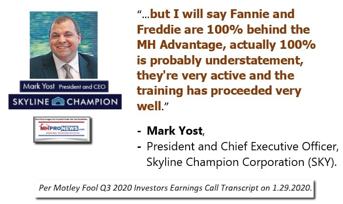 4) Last for today. That same 5.21.2020 investor call mentions that the GSEs and financing on HUD Code manufactured homes. How many so called “new class of manufactured homes” that MHI has branded “CrossModTM” homes, that Fannie calls “MH Advantage®” and Freddie refers to as “CHOICEHome®”.” How many such homes has Skyline Champion sold total since the program was created? In the light of a widely reported lack of traction for this program, doesn’t it make more sense to press the GSEs for lending on ALL HUD Code manufactured homes, instead of just select housing that have not been widely accepted in the marketplace?