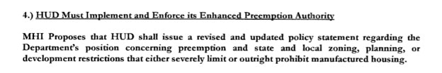 As the links and references provided in the MHProNews questions reflect, on paper, MHI has said it wants the full implementation of “enhanced preemption” provision of the Manufactured Housing Improvement Act of 2000. As the first bullet you above you provided says, that would benefit the entire industry. With that noted, the questions.