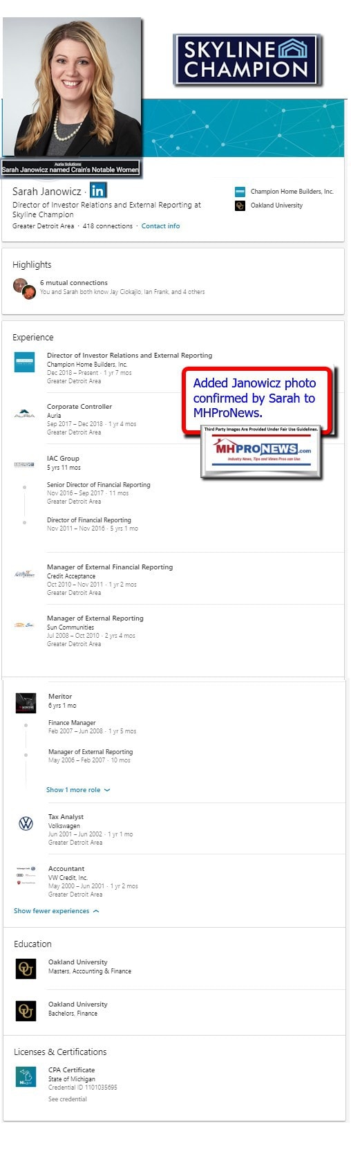 Sarah Janowicz is the Director of Investor Relations and External Reporting Skyline Champion Corporation. Janowicz recently made a series of on-the-record responses to MHProNews about information from the publicly traded firm’s most recent May 21 Q4 2020 Earnings Call. As the transcript on those questions and answers (Q&A) will make clear, Janowicz first consulted with others in their legal and corporate leadership before providing the replies that are exclusively published below.