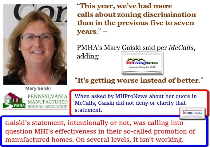 b) Then Manufactured Housing Institute EVP Lesli Gooch, who is now MHI’s CEO, stressed in a letter to HUD their stated concerns about a “growing trend of municipalities using zoning ordinances to mandate manufactured housing construction standards beyond the HUD Code and as a result effectively “zoning out” manufactured housing.” In that letter to Edward L. Golding, then HUD’s Principal Deputy Assistant Secretary Office of Housing, and Helen R. Kanovsky HUD’s General Counsel, Gooch said “We [MHI] believe that HUD has the authority to move beyond a case-by-case approach to this challenge.” She cited the language from the Manufactured Housing Improvement Act of 2000. Specifically, “Federal preemption….shall be broadly and liberally construed to ensure that disparate State or local requirements or standards do not affect the uniformity and comprehensiveness of the standards….” See the document dated May 26, 2016 linked here.