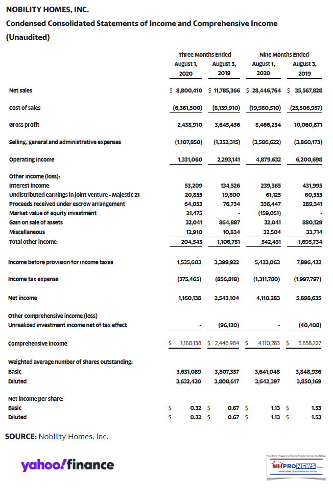 OCALA, FL / ACCESSWIRE / September 11, 2020 / Today Nobility Homes, Inc. (OTCQX:NOBH) announced sales and earnings for its third quarter ended August 1, 2020. Sales for the third quarter of 2020 were $8,800,410 as compared to $11,785,366 recorded in the third quarter of 2019. Income from operations for the third quarter of 2020 was $1,331,060 versus $2,293,141 in the same period a year ago. Net income after taxes was $1,160,138 as compared to $2,543,104 for the same period last year. Diluted earnings per share for the third quarter of 2020 were $0.32 per share compared to $0.67 per share last year.