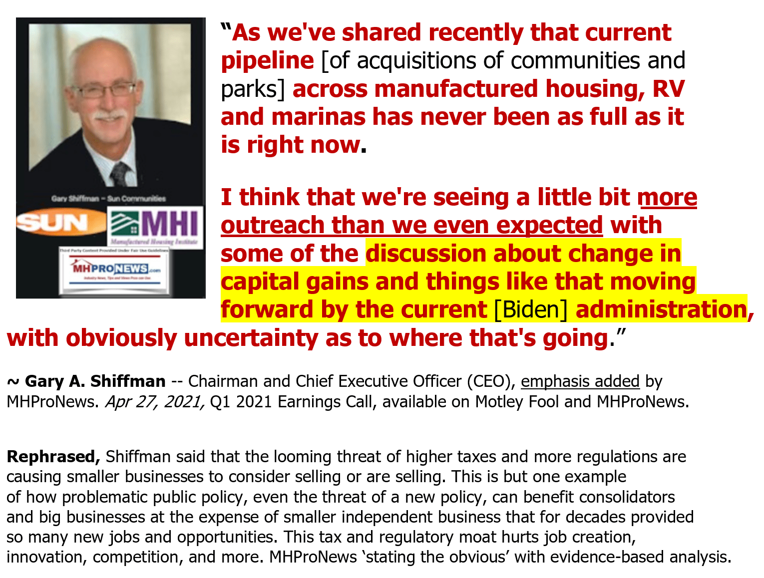 ~ Gary A. Shiffman — Chairman and Chief Executive Officer (CEO), emphasis added by MHProNews. Apr 27, 2021, Q1 2021 Earnings Call, available on Motley Fool and MHProNews. Put differently, Shiffman has revealed how fear of higher taxes and more regulations are being used as a barrier of persistence that are driving more selling by independents, which benefits consolidators.