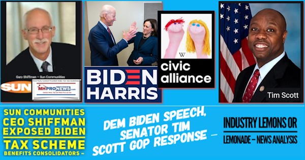 Each aspect of the headline will be addressed in this lemons or lemonade examination of the decades of mendacious hypocrisy used by America’s so-called corporate and political elites, much of which are on full display this week. For decades, American working class, middle class, retirees, independent smaller business owners – including people from all backgrounds and beliefs – have swallowed the bitter dregs of programs and policies that postured one thing but delivered another. Thanks to voices across the left-right divide, that problematic pattern is now out in the open. It is on full public exhibit, thanks in part to the revealing deeds of the billionaire and big corporate-backed Civic Alliance and their Biden-Harris led political front team. Ironically, it is Sun Communities Inc (SUI) Chairman and CEO Gary Shiffman who perhaps unwittingly exposed how a key element of the White House Resident Biden tax hikes plan benefits consolidators, that includes Shiffman’s own virtue-signaling ESG embracing firm.