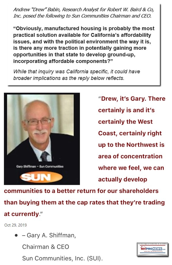 More specifically, the other sponsor for MHI’s webinar is member and publicly traded Sun Communities (SUI). Sun Chairman and CEO Gary Shiffman said almost two years ago that there are times that they could be developing sites at a lower cost than they were buying sites. With MHI member Marcus & Millichap (MMI) reporting further compression on cap rates and per-site costs to buy an existing manufactured home community, presumably Shiffman’s point is more apt today than at that time.
