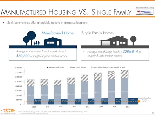 The Sun IR material arguably does a far better job of making the case for manufactured homes and communities than the Manufactured Housing Institute does. There is a case to be made that the various forces in manufactured housing are artificially manipulating the market. That’s something investors can – and some do – take seriously. For investors with sufficient moxie and resources, that can be an opportunity in disguise. For those who aren’t it is an added risk that must be understood. One example of that topic is found in the linked box below.