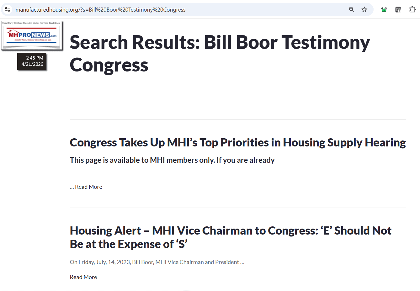 1. As a backdrop to what follows from Bill Boor and MHI CEO Lesli Gooch, Google’s artificial intelligence (AI) overview function (GAIO) was asked the following on 4.21.2026. “Can you find a 2025 or 2026 version of this document from the Manufactured Housing Institute? “2024 Federal Policy Objectives” https://www.manufacturedhomepronews.com/wp-content/uploads/2026/04/2024-MHI-Federal-Policy-Objectives-2.5.24-3-ManufacturedHousingInstitute-ManufacturedHomeProNewsMHProNews.pdf” The response from GAIO (see Part I) was significantly different than the reply to a similar request shown in Part II. That noted, GAIO pointed out that MHI apparently had no publicly available policy document for 2025 or 2026, but pointed instead to the testimony from Boor to Congress as filling that void.