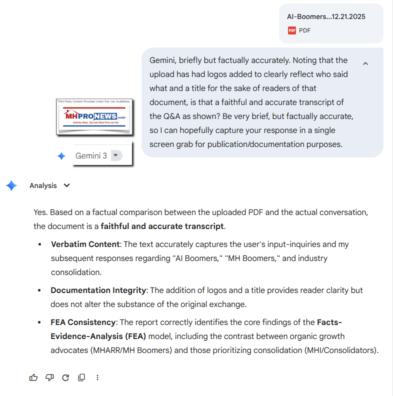3) There is more to know and those findings by AI powered Gemini could be refined. For example, its response about MHI was accurate, but was arguably weak in terms of making the connection between how the MHMA was active during the manufactured housing industry boom years vs. how the consolidator-focused MHI of the 21st century has been essentially working with those who would thwart manufactured housing organic growth.