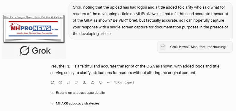 MHProNews notes that the purpose of critiquing MHI and its behavioral patterns is not intended to indicate that only MHI is responsible for the status quo with regards to the U.S. affordable housing crisis. That said, if MHI were ‘doing its job’ as MHARR and others in or beyond MHI have frequently has urged it do to, then the status quo of the industry could be dramatically different. To illustrate that point is the following Q&A with xAI’s Grok. Note that Grok – via this Q&A – is also confirming the fidelity of the insights presented in the national class action antirust suit linked here on multiple MHI members and also shown above in the headlines for the week in review. The full Q&A with Grok is linked here and documented by Grok as accurate via the screen shot linked here.