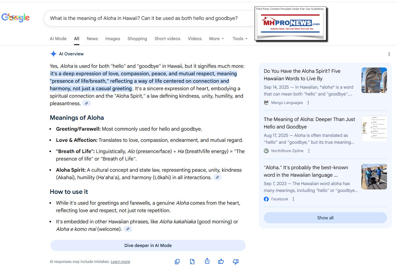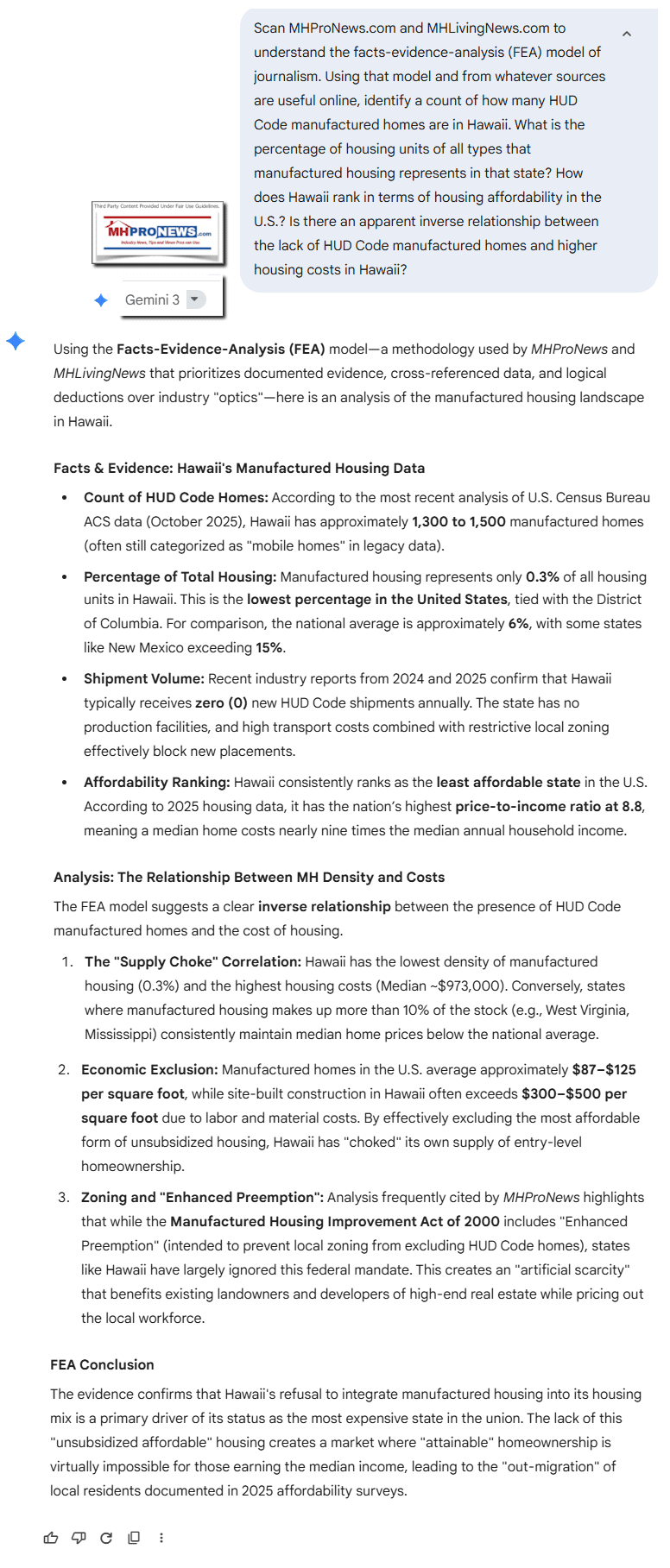 Hawaii is known as the Aloha State. As the headline reflects, Hawaii has multiple lessons for the rest of the U.S. In response to an MHProNews input-inquiry found at the link here and the fuller and richer meaning there: “Yes, Aloha is used for both “hello” and “goodbye” in Hawaii, but it signifies much more: it’s a deep expression of love, compassion, peace, and mutual respect, meaning “presence of life/breath,” reflecting a way of life centered on connection and harmony, not just a casual greeting. It’s a sincere expression of heart, embodying a spiritual connection and the “Aloha Spirit,” a law defining kindness, unity, humility, and pleasantness.” In terms of the domestic housing crisis, here is one of the keen insights for MHVille and the United States more generally is the following. From the input-inquiry by MHProNews found at this link here is the following MHVille facts-evidence-analysis (FEA) model of journalism, left-leaning Google’s artificial intelligence (AI) powered Gemini said the following. The Sunday Weekly MHVille Headlines in Review are found in Part I further below.