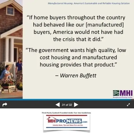 One ought to wonder why the headline quote attributed by the Manufactured Housing Institute (MHI) to Warren Buffett is only found in some 6 Google searches? Why was it used in a Manufactured Housing Institute (MHI) PowerPoint document presented to the National Rural Housing Conference, but apparently isn’t found on Clayton Homes, or MHI’s own website? Why is this quotation limited to a few sources that offer the MHI PowerPoint, two posts on MHProNews, and two on Mobile and Manufactured Home Living News (MHLivingNews)?