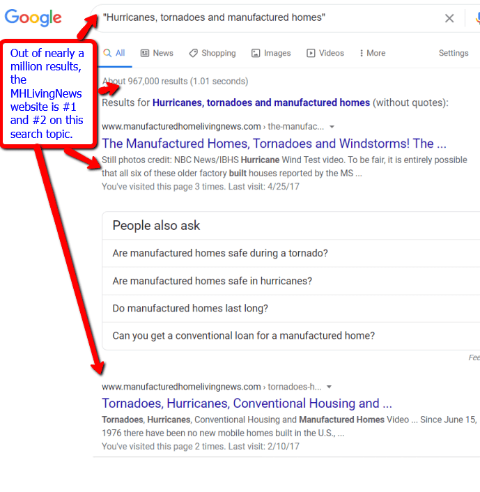 MHProNews and our MHLivingNews sister site are on page 1, often at or near the top on several issues of importance that are manufactured home specific. One example is linked below.