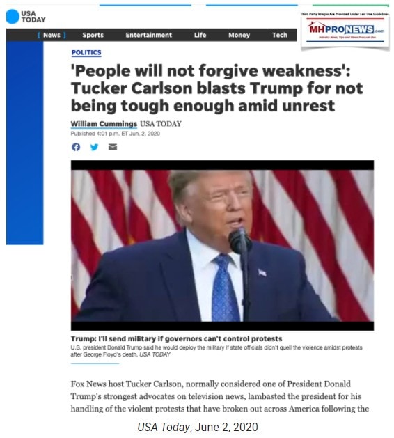 A similar dynamic prevailed during the sustained protests and riots that erupted after the killing of George Floyd. While conservatives such as Sen. Tom Cotton (R-AK), in his controversial New York Times op-ed, urged the mass deployment of the military to quell the protesters, and while Trump threatened to deploy them if governors failed to pacify the riots, Trump failed to order anything more than a few isolated, symbolic gestures such as having troops use tear gas to clear out protesters from Lafayette Park for his now-notorious walk to a church, provoking harsh criticism from the right, including Fox News, for failing to use more aggressive force to restore order.