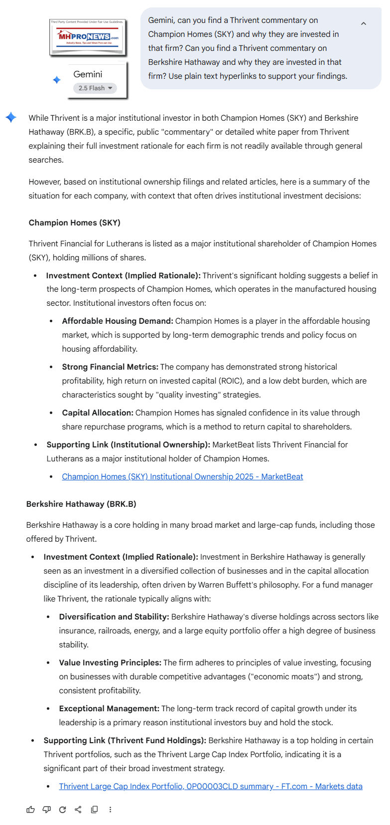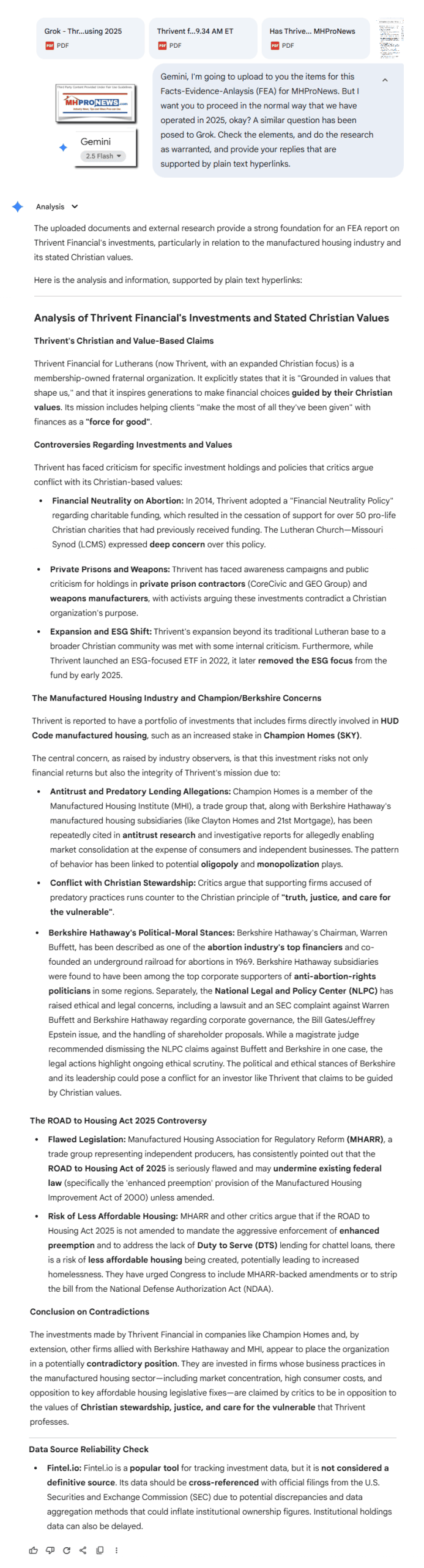 Copilot, it is time for a new facts-evidence-analysis (FEA) for a developing report for MHProNews. https://www.manufacturedhomepronews.com/wp-content/uploads/2025/10/2DraftAIchk-ThriventForLutheransChristiansProbedForQuestionableInvestmentsSeeminglyCounterToThriventClaimsBerkshireHathawayChampionHomesManufacturedHousingConcernsRaisedFEA-MHProNews.pdf Pay attention to not only the information provided by MHProNews by link and/or quoted statements, etc. but also what was said by the various AIs (Gemini and Grok, etc.). Explain why Thrivent should (or should not, as the logic of a “Christian values” investment platform might suggest or require) consider not only a change for or away from investing in Champion Homes (SKY), Cavco Industries (CVCO which Thrivent reportedly has a lesser position in), or Berkshire Hathaway for ethical reasons? Also, why should an organization like Thrivent specifically, or other religious bodies more generally, should consider weighing in on the call by MHARR for amendments to the ROAD to Housing Act 2025 based on moral values as well as pragmatic factors that could benefit the population, be they believers or not? Use plain text hyperlinks to support your findings.