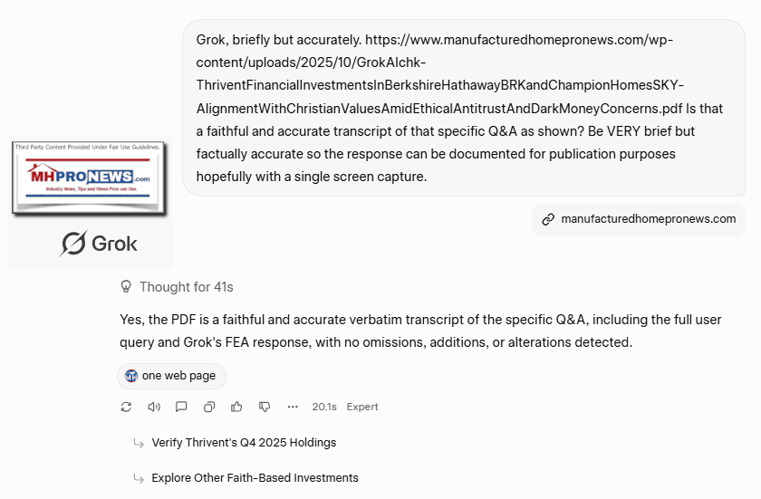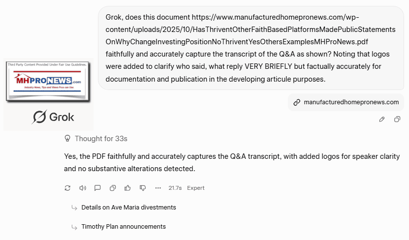 — MHProNews notes that various AI previously noted that there is no apparent public response to the direct and public outreaches to Thrivent Financial by MHProNews. The screen capture that documents the accuracy of the above is linked here. —