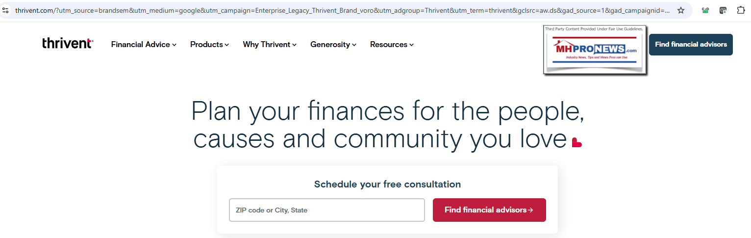 According to the “popular tool for tracking investment data” fintel.io, Thrivent Financial for Lutherans has a broad portfolio of investments that includes firms that are directly involved in HUD Code manufactured housing. Thrivent has an array of investments in the following sectors, shown as follows in no particular order of importance. Retail. Tech. Media/Entertainment. Housing. Finance. ETFs. Automotive. RVs. Education. Energy. Healthcare/Pharmaceuticals. Rentals. Food. Restaurants. Apparel. Cosmetics. Gambling. Insurance. “Plan your finances for the people, causes and community you love,” says a header near the top of the Thrivent.com website on 10.25.2025 (bolded added herein by MHProNews as shown for emphasis). From the Thrivent Financial for Lutherans about us page: “Finances as a force for good” and “With our unique combination of financial services and generosity solutions, Thrivent helps our clients make the most of all they’ve been given.” Also from the thrivent.com about us page on this date: “We believe money is a tool, not a goal,” and “We’ve inspired generations to make financial choices guided by their Christian values. We provide the expertise and support that enable our clients to take care of themselves and others.” “Grounded in values that shape us,” and “Our unique business model as a membership-owned financial services organization allows us to take a client-focused, long-term view to all we do—helping people and their communities thrive.” The headline question regarding this facts-evidence-analysis (FEA) probe into Thrivent is this. Does Thrivent truly invest in a manner consistent with their own claims? Are there investments into firms linked to manufactured housing in keeping with “Christian values” or not?