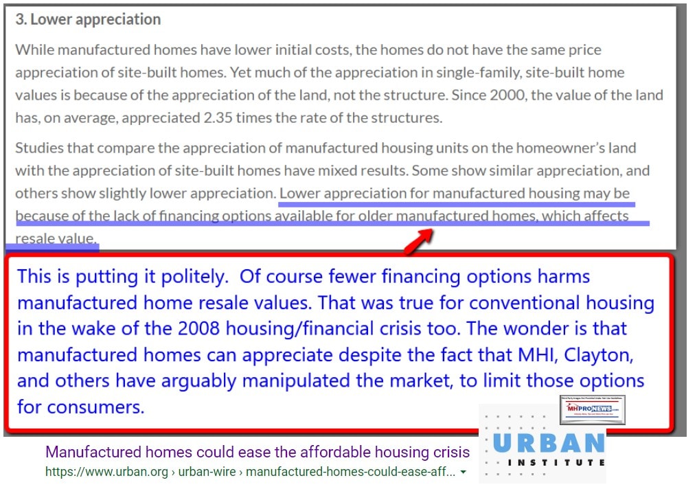 But purported market manipulation also has the impact of undermining the value of independently owned manufactured home businesses. That logically means that Clayton Homes and others who are ‘consolidating’ the industry – who are routinely MHI members – are evidently doing so at a discounted valuation than what would occur in the absence of such market manipulation. Meaning, such undermining of lending on manufactured housing harms independents who produce manufactured homes in factories, suppliers, retailers, community owners, and others.