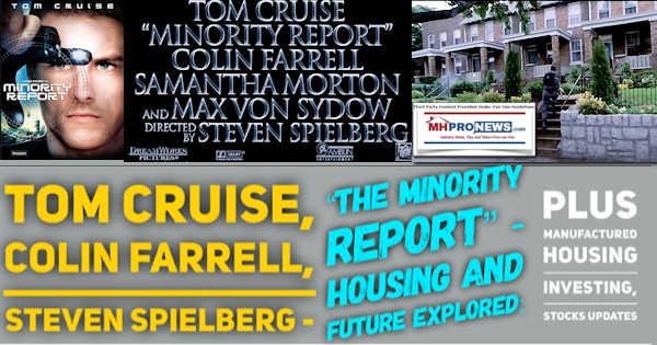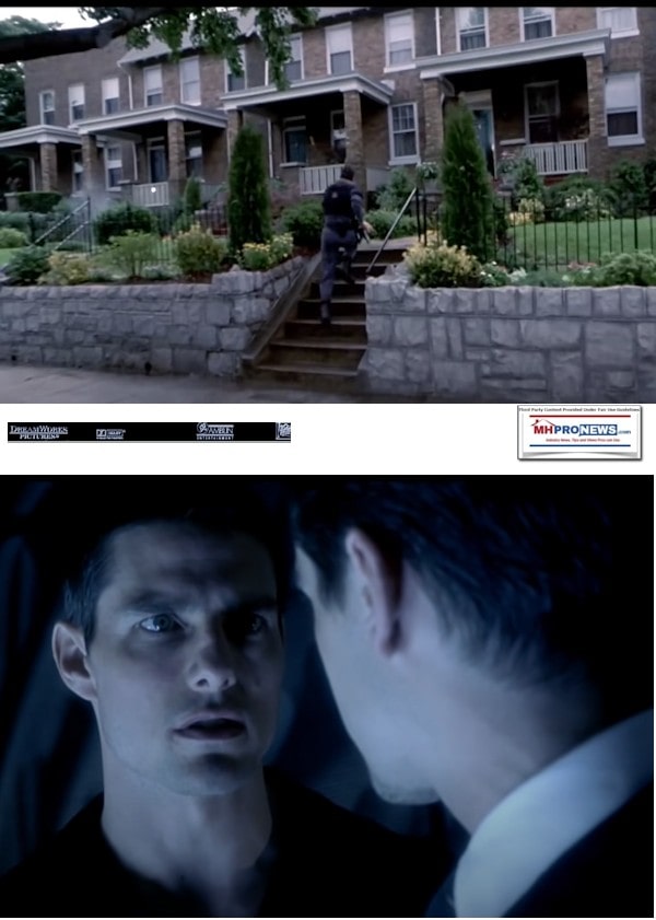 In Ready Player One, that director Steven Spielberg movie depicted our affordable homes profession through the dark vision of 50-year-old metal exterior “mobile homes” in ugly, depressing high-rise “stacks.” But in the hit movie, The Minority Report, that hit Spielberg directed flick stating Tom Cruise, Colin Farrell, Samantha Morton, and the late Max Von Sydow projected future shows manufactured homes…not readily apparent at all. Because movies, television, music, books, and other aspects of culture influences life, and the reverse is true too, a look at this hit streaming on Amazon Prime or which can be viewed with ads free on YouTube is useful exercise. Several intellectual but also pragmatic levels of insights are examined below. There is a mix of third-party and original MHProNews analysis. A change of pace from industry political issues is useful too.