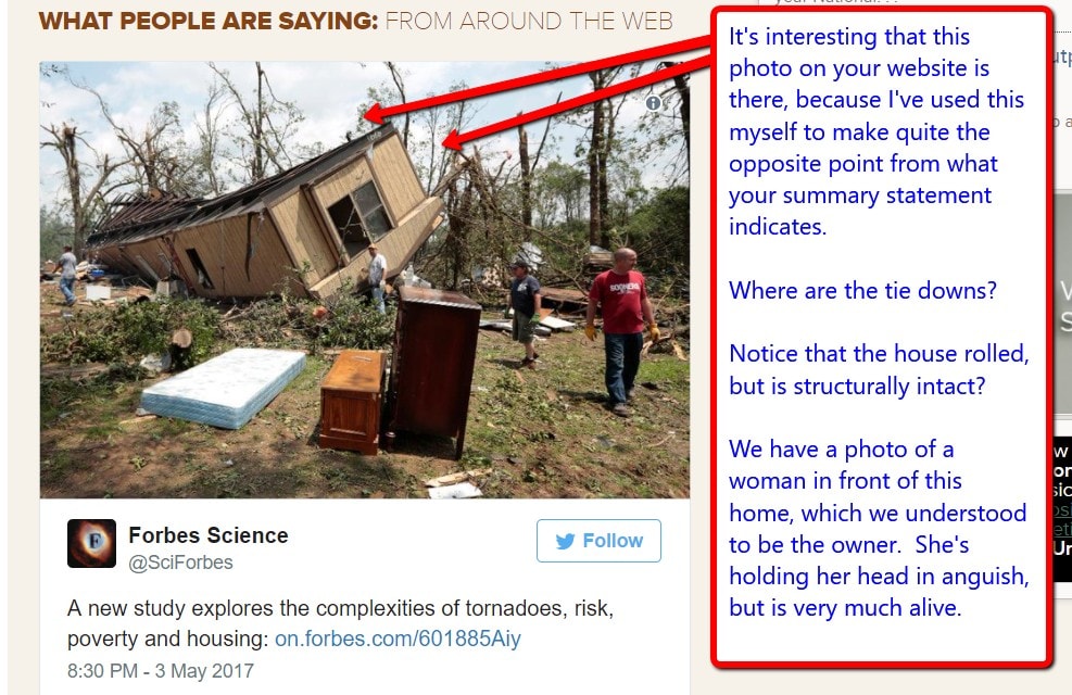 Back to the tornado issue, thousands of manufactured home professionals are well aware that this is a topic on the minds of consumers. The fact that MHI has something on their site is perhaps due in part to the fact that MHProNews and MHLivingNews have hammered on this issue for several years.