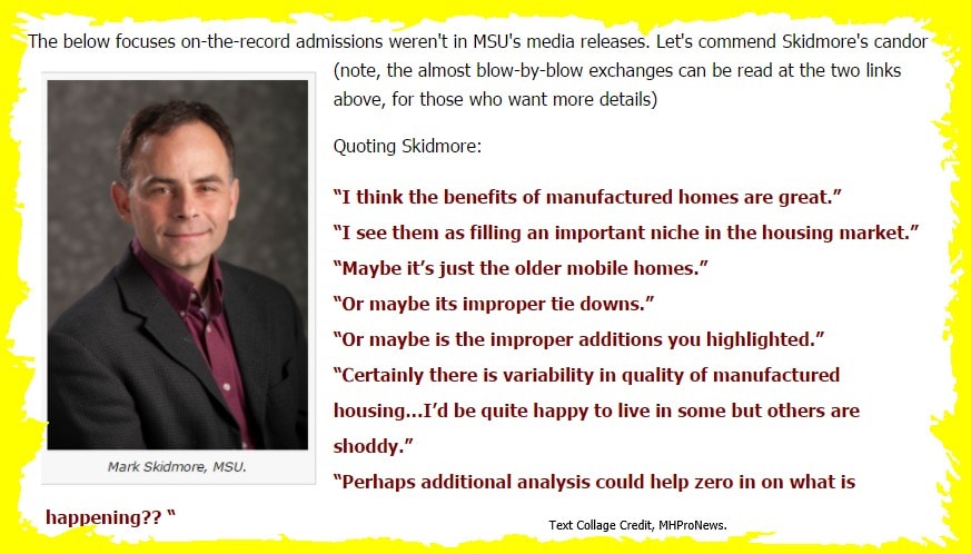 Longer-term readers may recall the following from Professor Mark Skidmore, who did a report for Michigan State University (MSU) that was revealed to have several problematic features. When pressed by MHProNews, Skidmore admitted on the record via email several things. “I think the benefits of manufactured homes are great,” said Skidmore, the MSU economist said. The following pull quotes were part of that same message.
