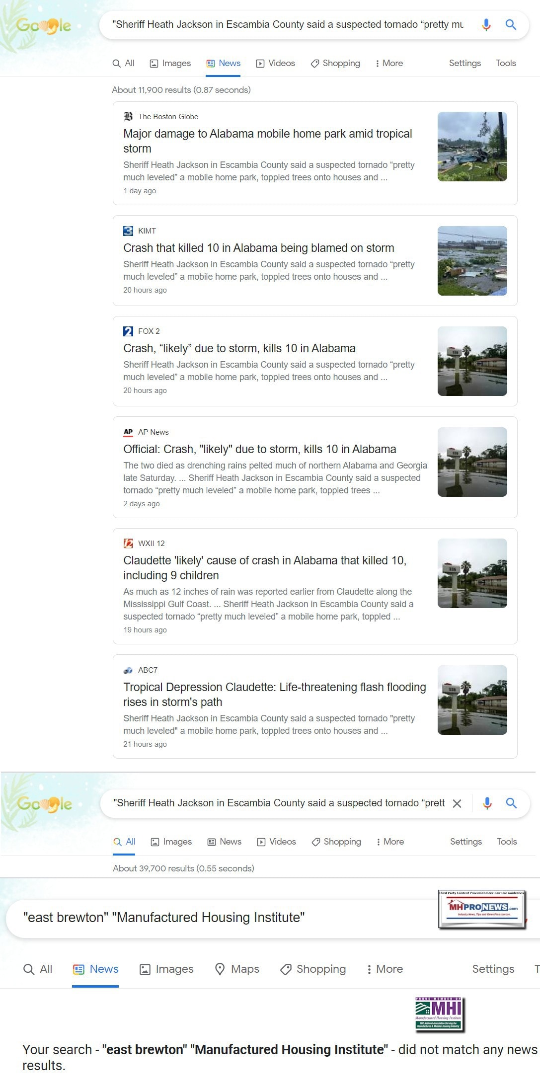 During a mushrooming affordable housing crisis, the importance of modern manufactured homes potential for filling the thirst by millions for quality low-cost homes ought to be apparent. One might think that the Manufactured Housing Institute (MHI) would have assigned their communications person, and/or other staff members, to contact media outlets and engage on this issue. While it occurred during a weekend, storms do not take weekends off. The biggest opportunity to address the issues is in the immediate aftermath of such events. But a similarly focused check of the Google news tab makes it clear that MHI did not touch the topic at all (see screen capture above).
