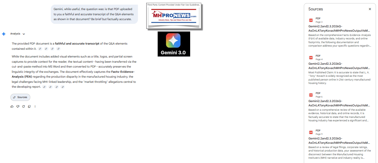 Part II. MHProNews’ goal of using the facts-evidence-analysis (FEA) method with third-party artificial intelligence (AI) is to generate more reliable and FEA supported information. Ideally, human intelligence (HI) and artificial intelligence (AI) combine to yield cross-checked for accuracy results. When AI glitches, those errant items are found in the PDF of the Q&A thread but are routinely edited out in what is displayed for readers in articles like this one, to avoid the risk of confusing readers. Meaning, both journalistic transparency and accuracy are served using this method. When HI is thought to have glitched, AI pushes back and in the back and forth that follows, clarity on a topic is found that is similar to academic-style rigor.