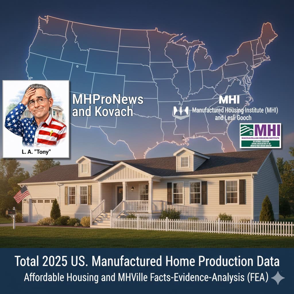 “The “key performance indicator” [KPI] of production [see Part I] is the most objective measure of [manufactured housing] industry health.” So said Google’s AI powered Gemini as part of a more detailed set of findings in Part II below. According to a source with the Manufactured Housing Association for Regulatory Reform (MHARR), “December 25 was 6800. So total 25 is 102738. 24 was 103,314. Percentages are as follows: monthly December decline = -3.9%. Annual cumulative decline= -0.55%.” So, the projection by MHProNews in December 2025 reporting that the industry would finish behind 2024 totals has now been confirmed. In considering the -0.55% dip in total national HUD Code manufactured housing production in 2025 from the prior year 2024, several factors ought to be considered. But what is clear is that during a well-documented affordable housing crisis, no amount of ‘happy talk’ from supporters of the narrative produced by the Manufactured Housing Institute (MHI) and those moving in that orbit can change the facts. Per Gemini (Part II): “Based on a comprehensive review of the available evidence, historical data, and online records, it is factually accurate to state that the manufactured housing industry has experienced a significant and documented “market throttling” effect that coincides with the [21st century] leadership era of the Manufactured Housing Institute (MHI).” Gemini and three other AIs have found that MHI is ‘posturing’ for the sake of ‘optics.’ A tipster in the MHI orbit recently told MHProNews that “…MHI [i.e.: the Manufactured Housing Institute]…seem to be doing an admirable job promoting MH [i.e.: manufactured housing] to the governing bodies in Washington, but what about Mr. & Mrs. America beyond the D.C. city limits?” That and other whistleblower remarks plus a significant MHI-linked document drop linked here point to posturing and narrative control over KPI measured performance.