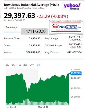 DowJones11.11.2020ManufacturedHomeStockUpdatesBroaderMarketSnapshot - Copy First, MHProNews wishes all veterans, their families, and those involved in our armed forces a happy Veterans day.