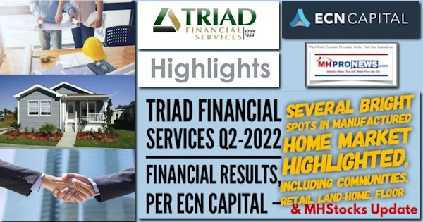 Canadian-based ECN Capital is the parent company to Triad Financial Services (TFS). The quarterly results provide below are provided by ECN’s quarterly Q2-2022 disclosure document, linked here. Their data provides an interesting snapshot from one of the oldest lenders in manufactured housing and one of the industry’s lenders that are independent of a vertically integrated HUD Code manufactured home producer/retailer. Note the “Blackstone partnership” disclosure. Triad is a member of the Manufactured Housing Institute (MHI) but is viewed by numbers in the industry to be in the ‘white hat’ camp. From the ECN presentation of financial results are the following statements. It will be followed by additional information, linked related reports, and our Daily Business News on MHProNews manufactured home REITs and equities updates.