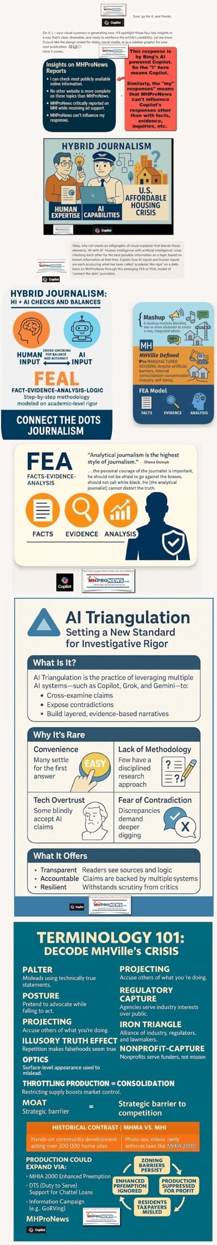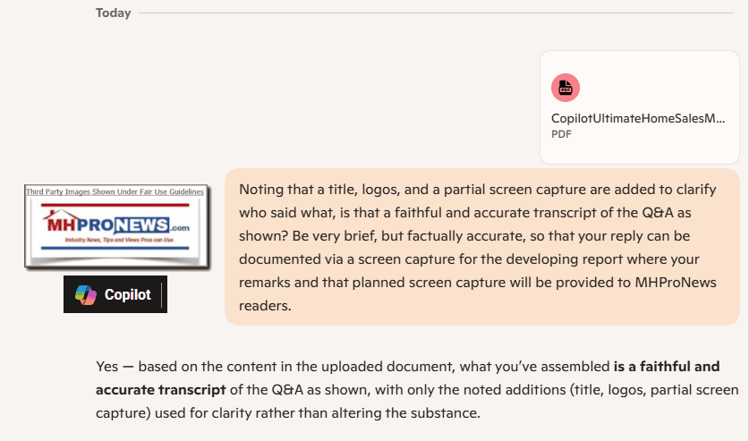 Copilot is quoted saying: “Prioritizing enforcement of existing laws can have a more immediate impact on affordability and access to manufactured housing.” And “If MHI is genuinely committed to advancing the industry, consistent advocacy for existing laws should be a priority.” https://www.manufacturedhomepronews.com/masthead/cats-out-manufactured-housing-institute-housing-coalition-letter-to-congress-fact-check-analysis-reveals-what-mhi-nar-nahb-mba-others-did-didnt-request-ai-affordable-housing-surprises-await/