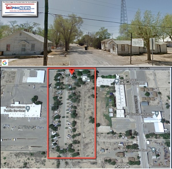 KRQE reports that the owner of the property died last year. They say conditions have been in decline since then. “Thursday night, the city council will take up the recommendation to have the property condemned,” said Todd Wildermuth, the City of Roswell Spokesperson. The sign on the property at 1114 E Bland St, Roswell, NM 88203 is partially faded, and the buildings associated with the property need attention. Arial evidence and the video suggests a mix of units that include pre-HUD Code mobile home, towable and motorized RVs, and manufactured homes at “…Village Mobile Home Park.”