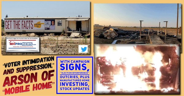 Signs along a roadway on private property and even a ‘mobile home’ – that might have been a HUD Code manufactured home – were set ablaze.