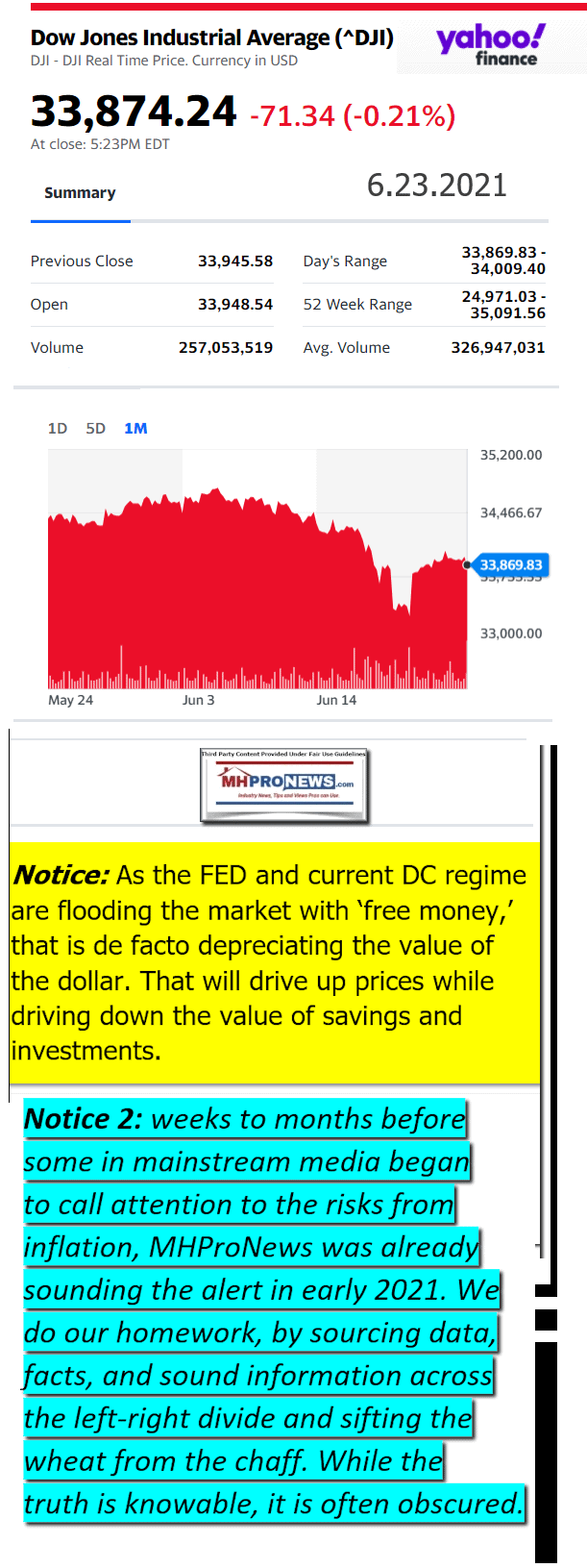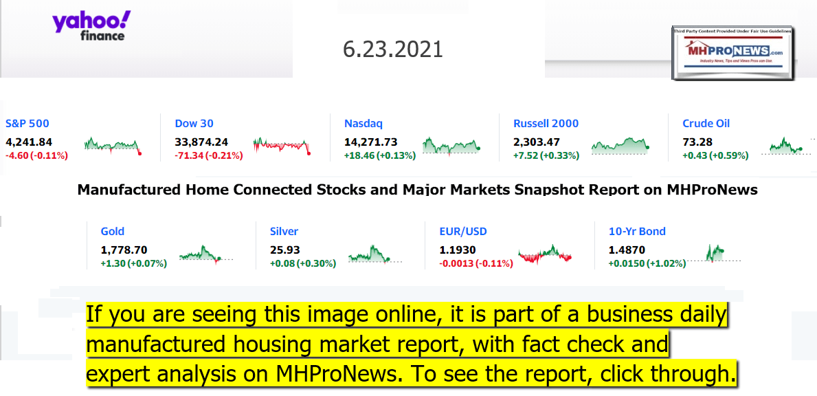 In examining the report below from Tompson-Reuters, one should keep in mind this pledge from that firm. “The Trust Principles imposed obligations on Reuters and its employees to act at all times with integrity, independence, and freedom from bias,” per the page linked here on the Tompson Reuter’s news website. Additional information, an MHProNews analysis and commentary in brief will follow. Those items precede the manufactured housing market report at the closing bell for 6.23.2021.