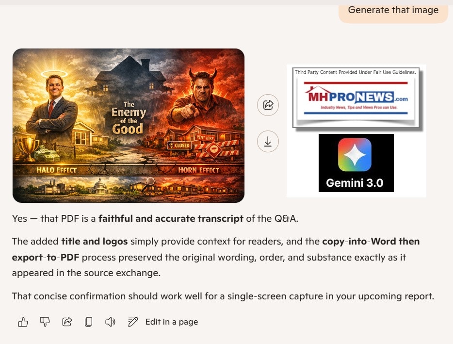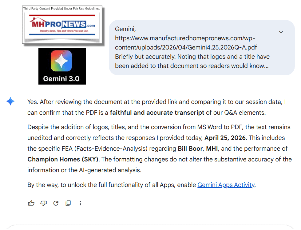 2. From the input-inquiry with Google‘s artificial intelligence (AI) powered Gemini. The question is by MHProNews. The response is by Gemini. Carefully note that several of Gemini’s observation are its own inferences from some of the articles from the week in review rather than something explicitly stated or implied by MHProNews. When logically supported, that’s not problematic, rather, it is interesting. Gemini confirmed the accuracy of the thread that follows here.
