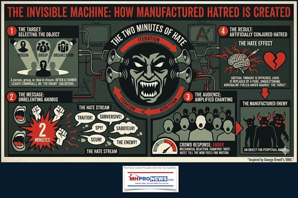 Day by day, certainly week by week for well over a decade, MHProNews has long focused on drawing on a range of sources that span the left-right divides. When it comes to politics, it is demonstrably true that there are no perfect politicians or parties. Sometimes politicos focus on demonizing their opponents (the horn effect) in a fashion that may fit the Orwellian “Two Minutes of Hate.”