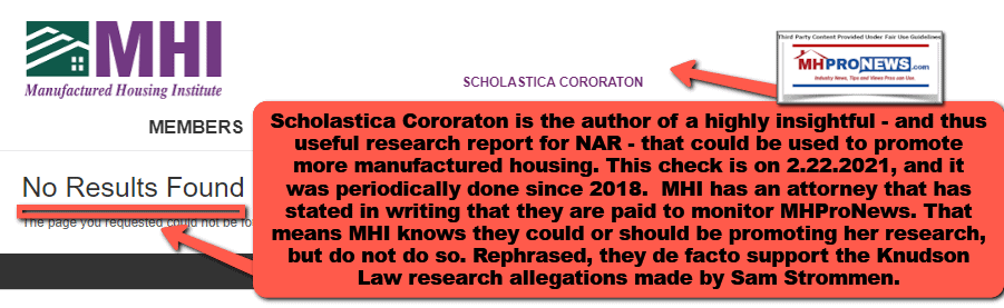Scholastica Cororaton is the author of a highly insightful – and thus useful research report for NAR – that could be used to promote more manufactured housing. This check is on 2.22.2021, and it was periodically done since 2018. MHI has an attorney that has stated in writing that they are paid to monitor MHProNews. That means MHI knows they could or should be promoting her research, but do not do so. Rephrased, they de facto support the Knudson Law research allegations made by Sam Strommen.