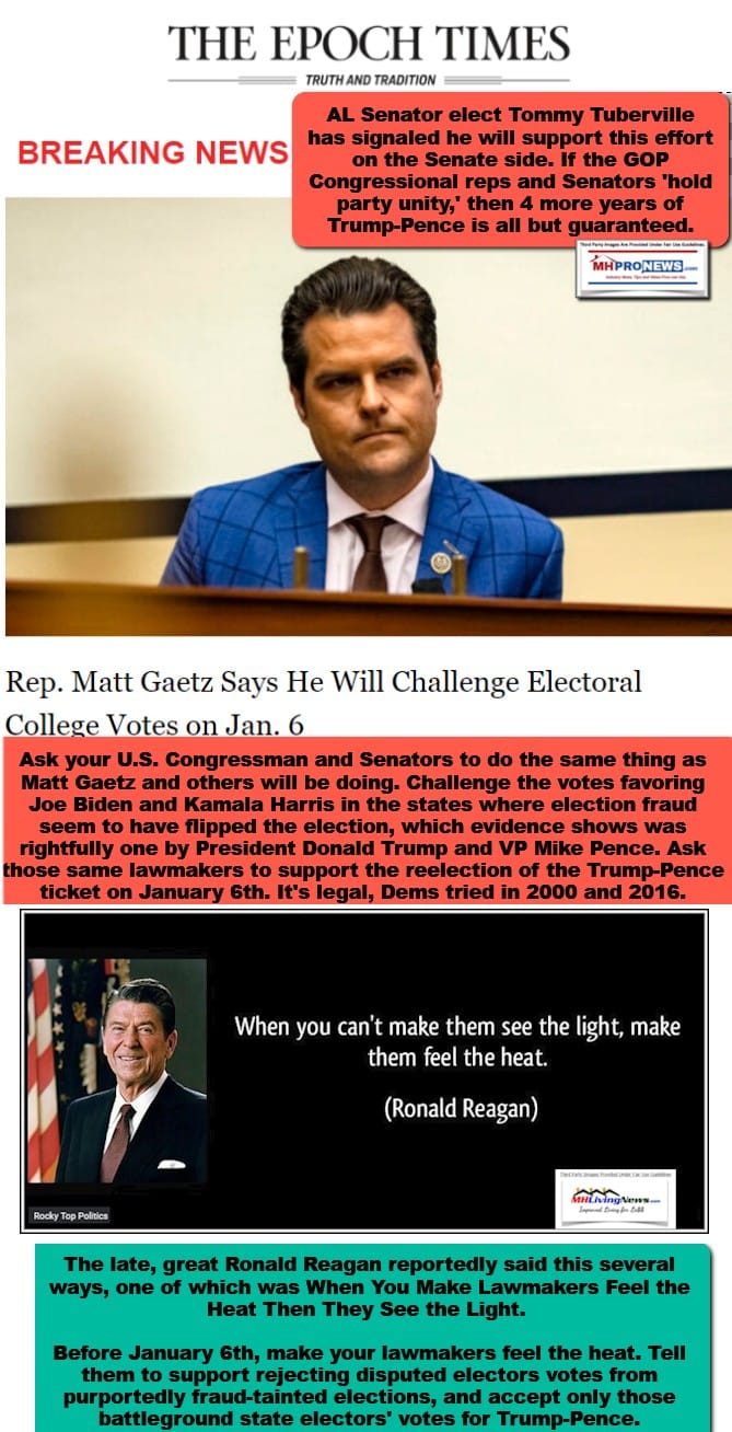 President Trump plans to hold a rally in Washington, D.C. on January 6th. But ideally, in our view at MHProNews, it makes sense for pro-Trump supporters to call their representative and two senators and insist that they support the rejection of disputed Biden-Harris electors and the accepting on January 6th of pro-Trump-Pence electors.