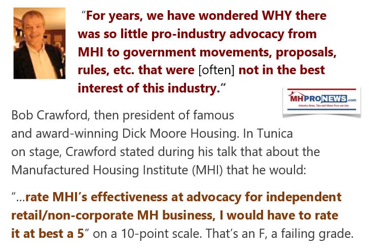 Then if the industry is underperforming – due in some part to ‘moat building’ schemes arguably deployed by Clayton Homes, affiliated Berkshire Hathaway manufactured home lenders and other ‘big boys’ at the Manufactured Housing Institute (MHI), the reality becomes clear that the industry could be doing several times more volume than is currently occurring.