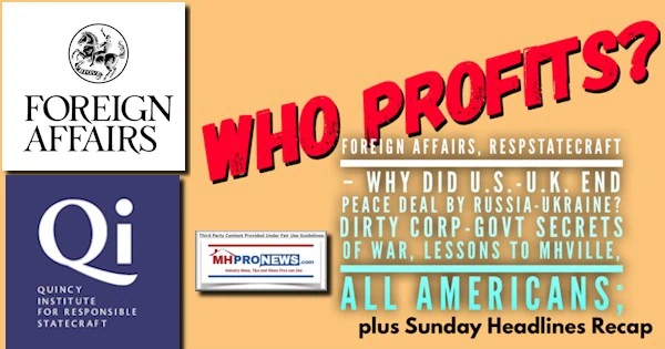 Connor Echols in Responsible Statecraft recently highlighted an article by Foreign Affairs that made the point that Russia and Ukraine had reached a tentative peace deal to end their war in April of 2022. Why was the deal scuttled? Or as their headline framed it “Diplomacy Watch: Why did the West stop a peace deal in Ukraine?” Because the costs of war are born by all involved, are adding to inflation, food, fertilizer, fuel, or other supply chain woes, and because there are potential lessons for manufactured housing industry professionals, those concerns will be examined. It is a sobering look at just how corrupt ‘the system’ can be, as the key takeaways from a range of sources shown are rapidly examined as today’s featured lead-in to the headlines for the week that was in MHVille found further below.