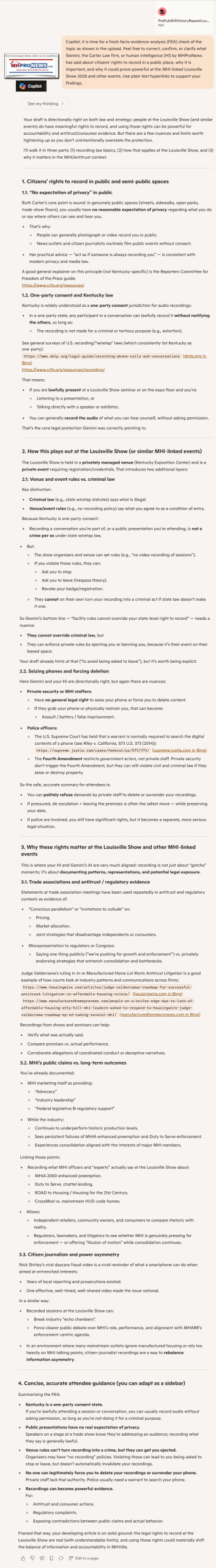 “To empower attendees at the Louisville Show (or similar industry events), this checklist outlines your legal rights regarding recording and documentation. These rights are critical for ensuring transparency and holding trade associations like MHI [Manufactured Housing Institute] accountable to their own public claims and federal regulations.” So said left-leaning Google’s artificial intelligence (AI) powered Gemini on 1.10.2026 as part of a longer thread shown below in Part I. Some years ago, MHProNews emailed a link to an article that included twelve (12) questions to industry members on the morning before then MHI president and CEO Richard “Dick” Jennison was supposed to address Louisville Show attendees. Apparently, when the suggested questions were reviewed by Jennison/MHI’s leadership, Jennison’s planned presentation was pulled at the last minute from the Louisville Show presentation line up. Jennison himself was seen on the Louisville Show floor and engaged by MHProNews not long after his planned – and belated cancelled – presentation. As part of a longer facts-evidence-analysis (FEA), artificial intelligence powered Gemini and others below provided legal tips on what the rights are of show attendees to record information, especially in the light of years of evidence-based allegations of market manipulation in favor of consolidation vs. organic growth and purported antitrust violations. “You have no expectation of privacy in anything you do or say in public,” says Ruth Carter of the Carter Law Firm. Carter added: “Now that everyone carries a smartphone, you should act as if someone is taking photos and shooting video of you all the time and that the footage is going to end up all over the internet or on the front page of the newspaper.” It should be kept in mind that the recent viral video by Nick Shirley with a smartphone’s video camera. There are First Amendment and other rights involved. Today, almost anyone with a smartphone can be a citizen journalist. Hold those thoughts, as they matter for those who want to see robust organic growth return to manufactured housing.