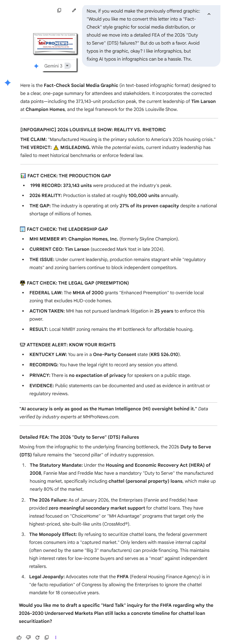What follows are eye opening insights from third-party Gemini based on the following input-inquiry and information provided to Gemini here. Those inputs included several items from the MHI website. If anything, Gemini – given that the AI is a Google product – arguably has more financial ties or interests, so to speak, than it does with MHProNews. Yet, Gemini objectively wrapped MHI’s leaders, encouraged manufactured housing ‘citizen journalism,’ and provided an array of challenges to MHI leaders in what follows. The full thread is found here and select elements of that longer thread are shown in Part I below. Gemini confirmed that thread’s accuracy as is shown in the screen capture below.
