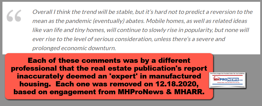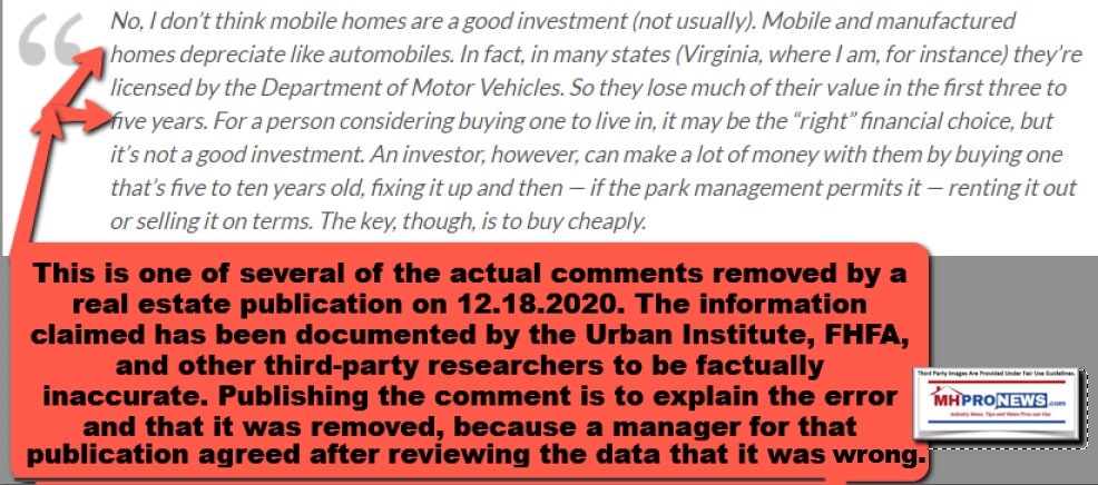 After direct engagement about a troubling report about manufactured housing, a real estate publisher that will be identified in an upcoming report deleted the following comment from their website on Friday 12.18.2020.